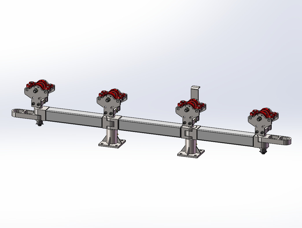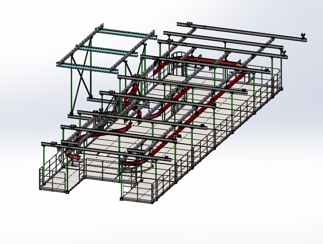树脂尾门在存储区完成来件检查后,由辅助装置班送至尾门输送线上,通过升降机、空中吊具搬送线到达尾门上装点位,同时,空吊具也通过线体返回上料工位。