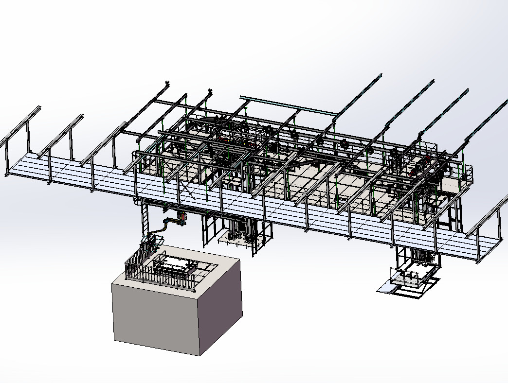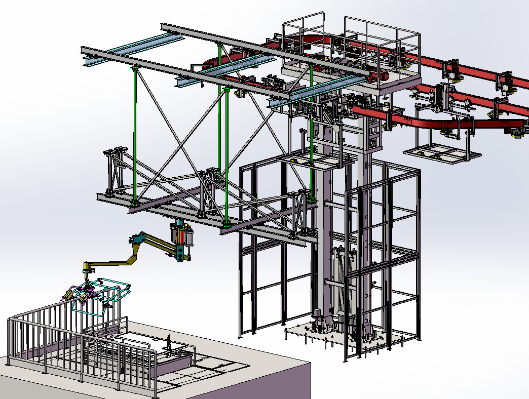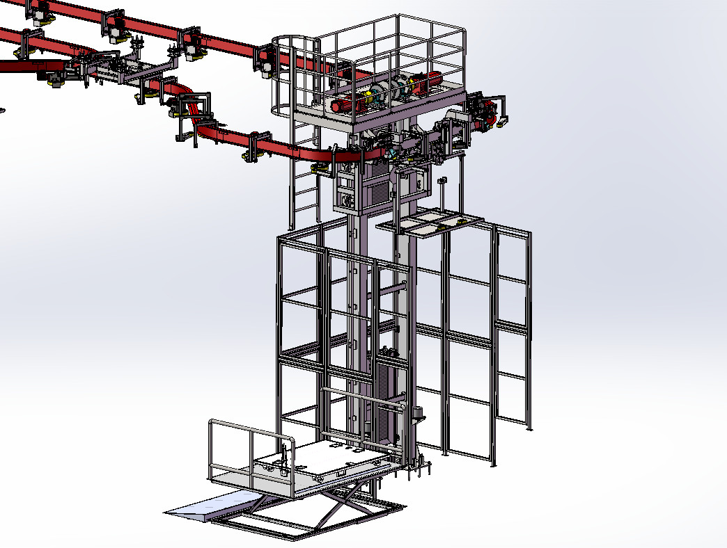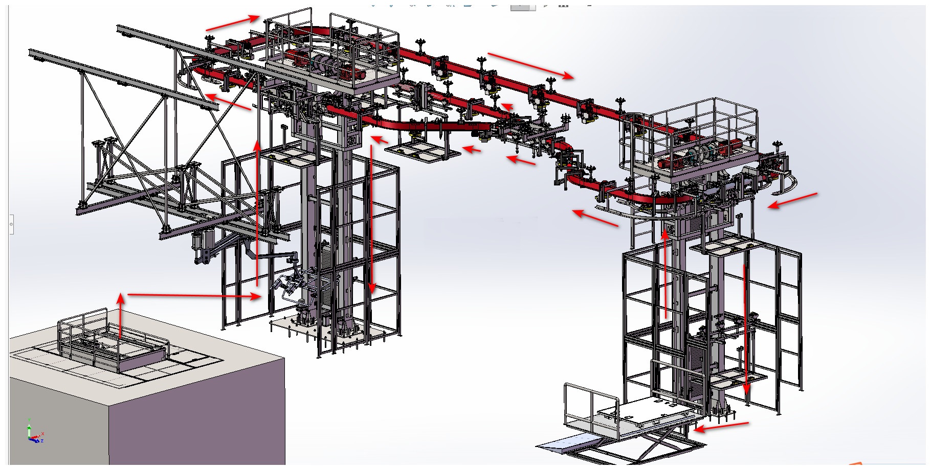 树脂尾门在存储区完成来件检查后,由辅助装置班送至尾门输送线上,通过升降机、空中吊具搬送线到达尾门上装点位,同时,空吊具也通过线体返回上料工位。
